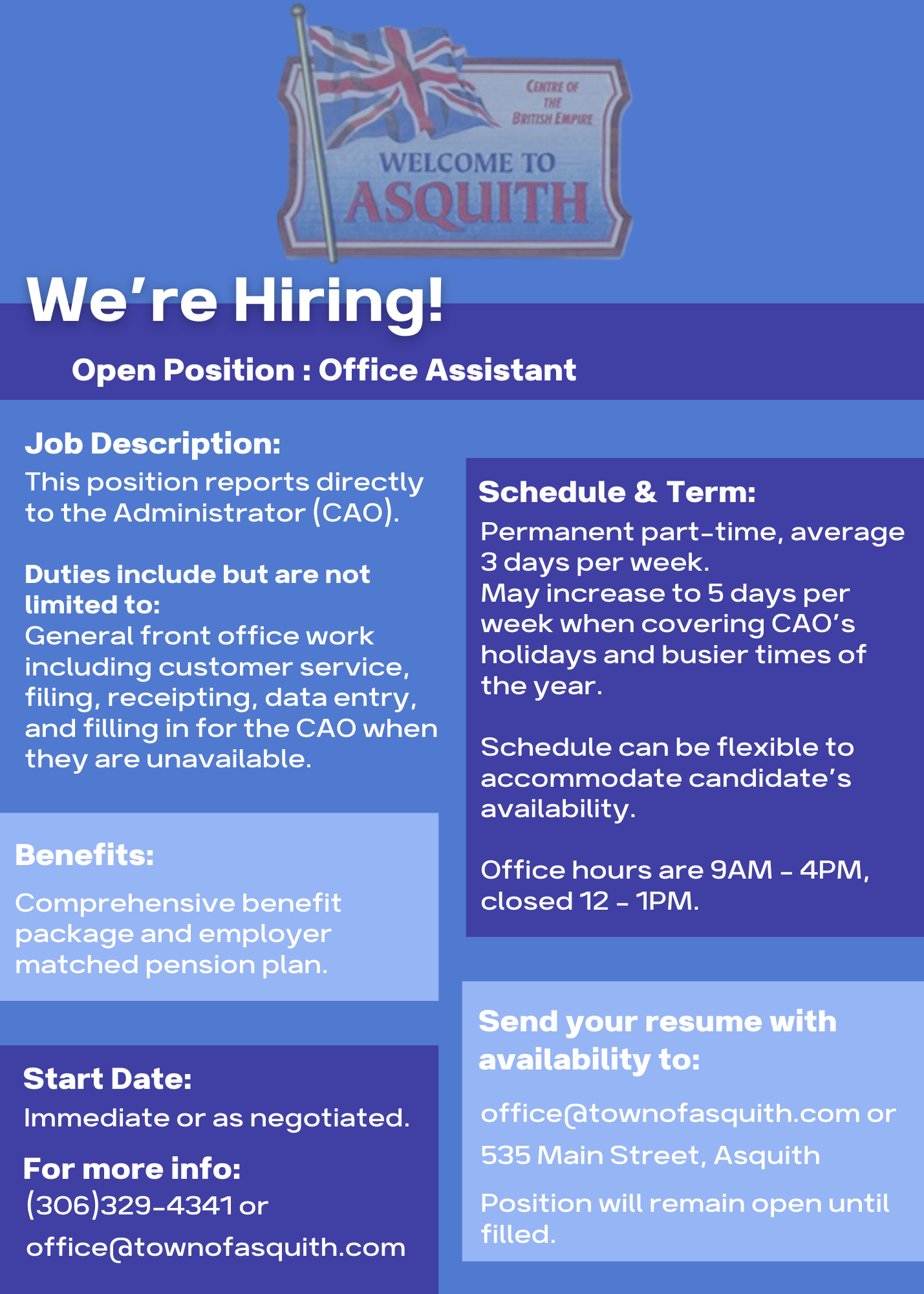 The community of Asquith wants YOU! Our community has a lot to offer potential new citizens and we are very excited about offering an ideal situation for someone who is looking to build a new residence or a new business. Asquith is a small but vibrant community that is close enough to the City of Saskatoon to offer its amenities, but far enough away to offer the joys of a small town community and small town living. Our tree-lined streets and friendly faces will welcome you to our community !