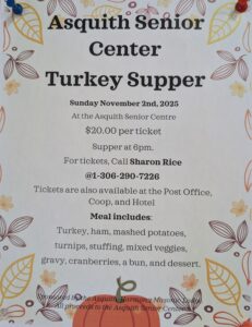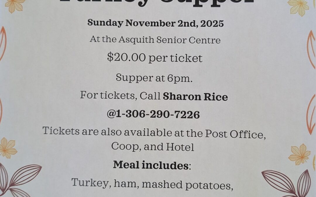 Turkey Supper by Kaila Montgomerie | Oct 21, 2025 November 2, 2025Turkey Supper6:00 pmAsquith Senior Centre